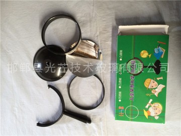 帶底座凹透鏡 直徑:10厘米 焦距:負(fù)300mm 幼兒園小朋友 或者中小學(xué)生認(rèn)識(shí)凹透鏡的特點(diǎn) 學(xué)習(xí)凹透鏡光學(xué)原理的的器材 尺寸大也時(shí)候教師教學(xué)演示用教具 知識(shí)拓展閱讀: 凸透鏡與凹透鏡可以從以下幾個(gè)方面加以區(qū)別:外形特征、對(duì)光線的作用、成像特點(diǎn)及用途等。具體方法如下: 方法一:用手摸,鏡子的中央部分比邊緣厚的是凸透鏡,鏡子的中央部分比邊緣薄的是凹透鏡。 方法二:隔著鏡子觀察距鏡子較近的書上的字,有放大作用的是凸透鏡;字變小的是凹透鏡。 方法三:隔著鏡子觀察距鏡子較近的書上的字,移動(dòng)鏡子,若發(fā)現(xiàn)像的移動(dòng)方向總是與鏡子的移動(dòng)方向相同,則該鏡子是凹透鏡;若發(fā)現(xiàn)像的移動(dòng)方向總是與鏡子的移動(dòng)方向相反,則該鏡子是凸透鏡。 方法四:隔著鏡子觀察窗外的物體,若能看到上下左右都顛倒的像,這種鏡子是凸透鏡;若看到像是正立的,這種鏡子是凹透鏡。 方法五:將點(diǎn)燃的蠟燭放在離透鏡適當(dāng)距離處,在另一側(cè)光屏上能得到倒立實(shí)像的是凸透鏡;無論怎樣調(diào)節(jié),在另一側(cè)光屏上不能得到像的是凹透鏡。 方法六:讓鏡子正對(duì)太陽光照射,在鏡子的另一側(cè)放一張與透鏡平行的白色卡片紙,耐心調(diào)節(jié)鏡子與紙之間的距離,能得到一個(gè)小亮點(diǎn)的是凸透鏡;始終不能獲得小亮點(diǎn)的是凹透鏡。 方法七:觀察陽光通過了兩副眼鏡在地面上形成的光斑,若形成光斑的中間比四周明亮,則鏡子是凸透鏡;若形成光斑的中間比四周暗,則鏡子是凹透鏡。 方法八:近視眼鏡,是用凹透鏡做成的。老花鏡,是用凸透鏡做成的。 說明:辨別凸透鏡與凹透鏡有好多方法,哪種方法好,要視具體情況而定。例如,如果待辨別透鏡的中央與邊緣的厚薄差異不明顯,就不能用“摸”的方法(況且精密光學(xué)儀器是不允許直接用手去摸的);在有太陽光與沒有太陽光的場(chǎng)合,所選的方法也不同??傊环N好方法,應(yīng)該簡(jiǎn)便、易行、有效。它是隨場(chǎng)合變化而變化的,不宜一概而論。 技巧:當(dāng)你想要判別兩件事物的相同和不同之處時(shí),就需要用比較與對(duì)比的方法。比較就是找出事物的相似性,即共同特征。對(duì)比是找出事物的不同點(diǎn)。用這種方法來分析事物,能幫助你發(fā)現(xiàn)一些平時(shí)容易忽略的細(xì)節(jié)。